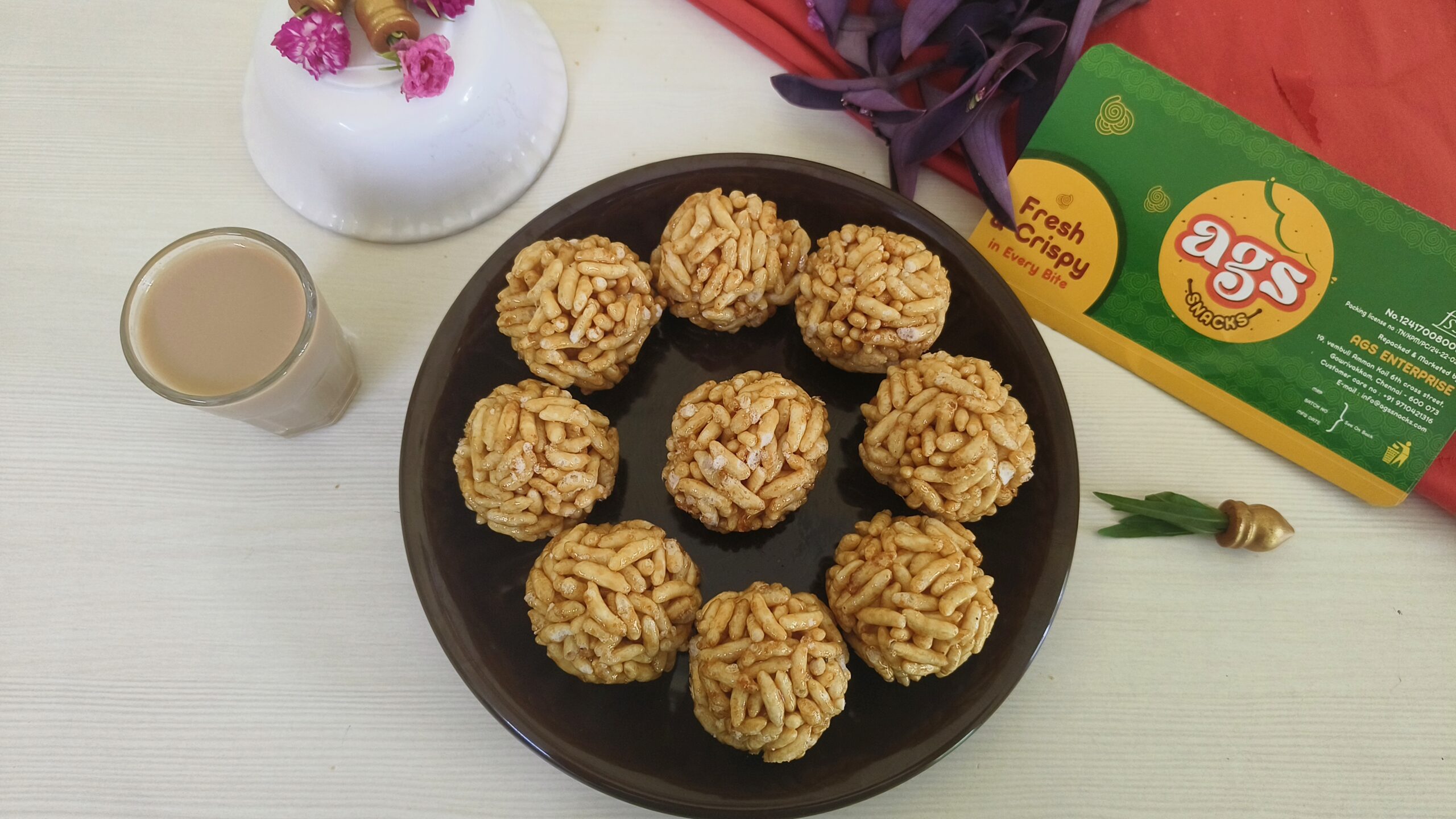 AGS Snacks Puffed Rice Balls is a healthy delicious sweet made with Puffed Rice, Jaggery syrup, caradamom and making with delicious Puffed rice balls. This snack will always gives us rich taste and tremendous protein content. AGS Snacks packed with love and care with no added preservatives & 100% vegetarian.